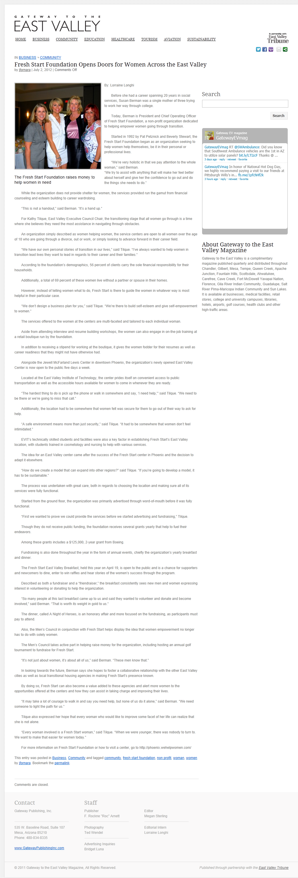 Susan Berman is the new President and Chief Executive Officer of Fresh Start Women's Foundation and began her new duties on September 12, 2011. Susan graduated from ASU with a Bachelors degree in Psychology and graduated from the University of Phoenix with a Masters degree in Counseling. Susan pursued her college education while raising her three children as a single parent. She has over 20 years experience in social services programs, management, and program design and development. Susan is a member of the American Counseling Association (ACA) and the National Career Counseling association (NECA) and is a Nationally Certified Counselor (NCC) through the American Counseling Association.